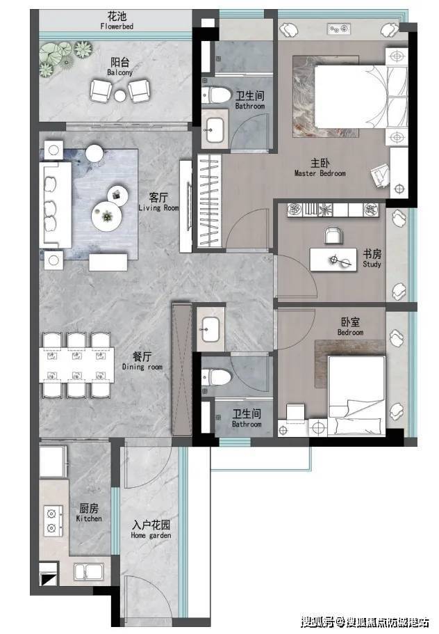 建面约120㎡四房:双阳台设计,客厅开间4.2米,适合二胎家庭或三代同堂;