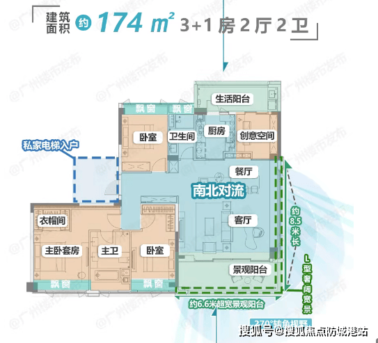建面约 174㎡四房两厅两卫:顶奢改善户型,一梯一户,270° 环幕 IMAX 景观面,约 6.6 米 + 8.5 米双景观阳台;LDKB 一体化设计,横厅尺度媲美 200㎡户型;独立四房设计,满足大家庭居住,舒适度拉满。