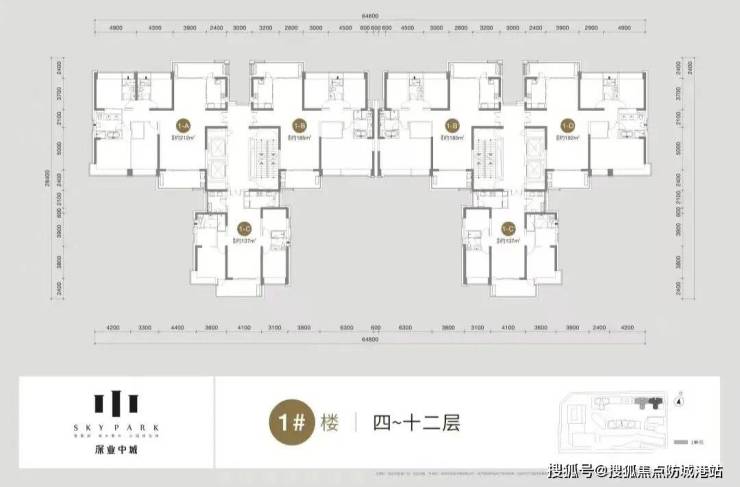 1栋:提供面积段为137㎡、185㎡、192㎡的三房单位及212㎡的四房单位,以及4套300㎡以上的顶层复式单位。其中36层及以下是2梯3户“品”字形结构,而37层及以上则为2梯2户的板楼结构。