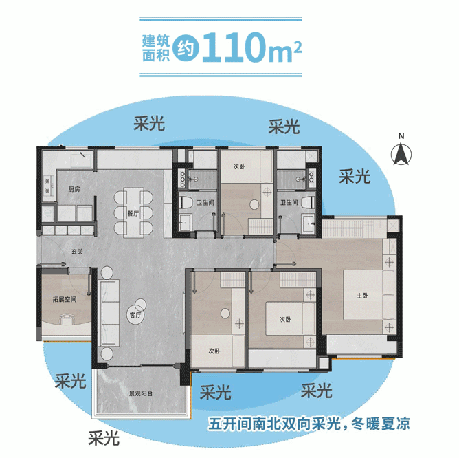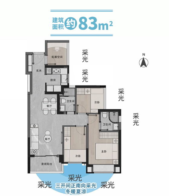 走进广建·云城学府的样板间,最直观的感受来自于其“N+1”户型设计带来的空间灵活性。以69平方米的两房户型为例,通过巧妙的空间规划,额外增加了一个可用作书房或多功能房的空间,形成了“2+1”的格局;而在83平方米和93平方米的户型中,则演变为“3+1”的四房布局;至于110平方米至182平方米的大户型,更是做到了“4+1”的五房配置。这种设计思路源于对《广州市建筑工程容积率计算办法(征求意见稿)》的积极响应,利用入户花园、阳台等半开敞空间的计容规则优化,实现了极高的赠送率。在实际使用场景中,这个“+1”的空间可以随着家庭生命周期的变化而调整功能:单身时可作为独立书房或健身区,新婚时可改为衣帽间,有了孩子后则变成儿童房或学习区,三代同堂时又能作为老人房或储物间。这种“成长型”的户型设计,避免了频繁换房的麻烦,让一套房子能够伴随家庭从二人世界走向三代同堂。高得房率不仅意味着同样的建筑面积下获得了更多的实际使用面积,更体现了开发商在产品设计上对用户真实需求的深度洞察,让每一平方米都发挥出最大的居住价值。