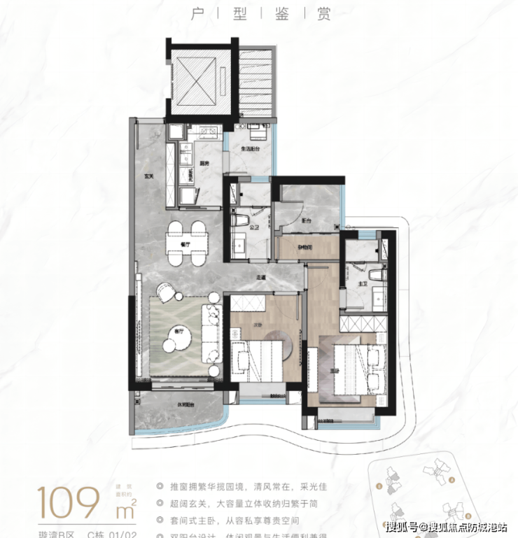 户型:109-161㎡三至四房,南北通透、高使用率,部分户型 270° 环幕江景;