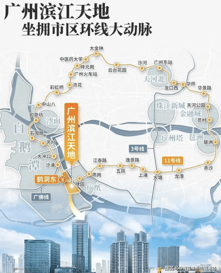 交通区位:双地铁上盖,广州 11 号线鹤洞东站步行 350 米,换乘广佛线、1 号线,30 分钟直达珠江新城、金融城、琶洲;