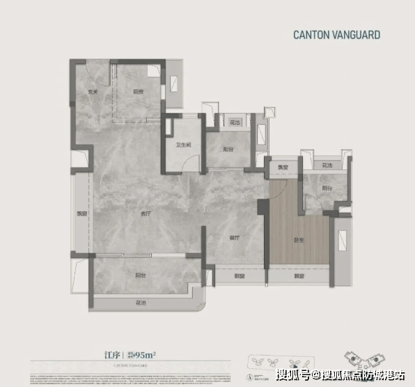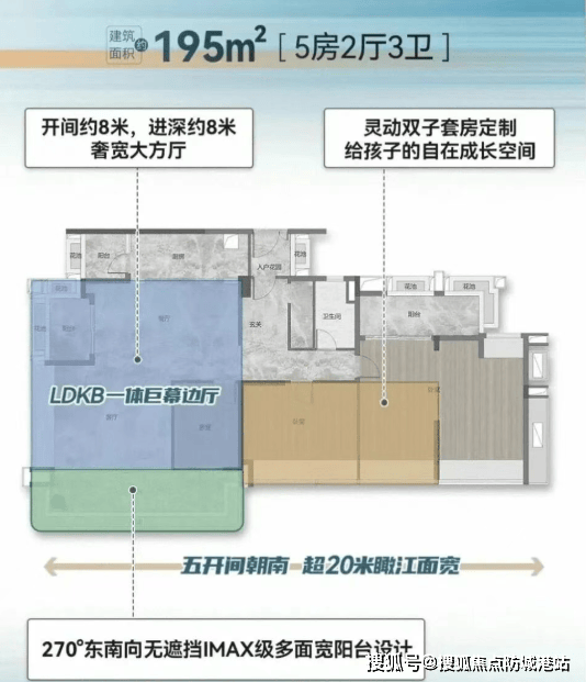 约95㎡四房:四开间朝南,双面宽阳台,约5.6米灵动宽厅搭配270°全景视野,小面积也能享大尺度江景生活;