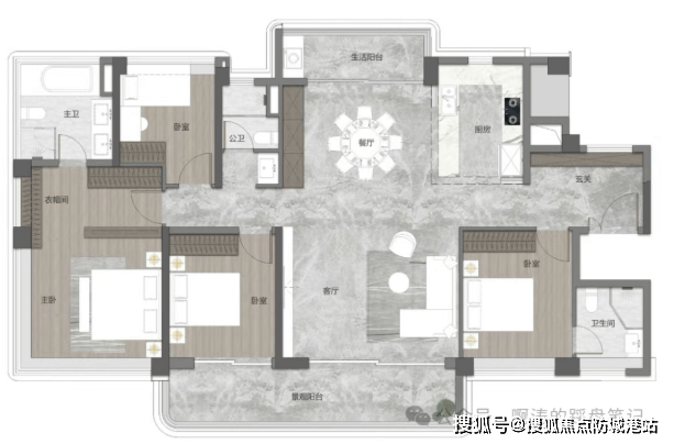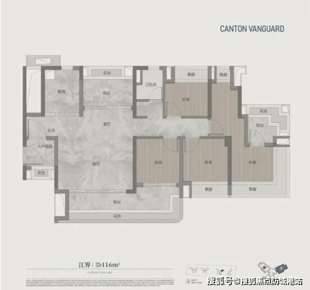 约116㎡四房:南北通透,独立入户玄关,主卧配置步入式衣帽间与双L型景观面,巨幕瞰江阳台将珠江画卷引入日常;
