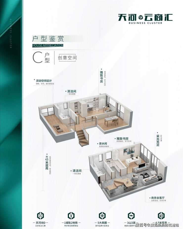 天河云商汇以创意办公空间和企业总部为主要规划方向,旨在打造一个集工作、生活、社交于一体的创新型社区。项目总建筑面积约为13.7万平方米,容积率低至2.0,提供了更加宽敞舒适的空间体验。其独特的建筑设计强调自然采光和通风效果,每栋楼都配备了落地大窗及观景台,让居住者能够尽情享受都市繁华与园林美景的双重盛景。