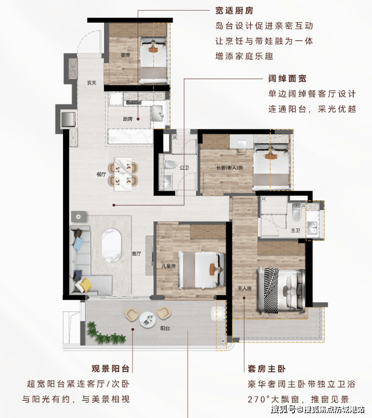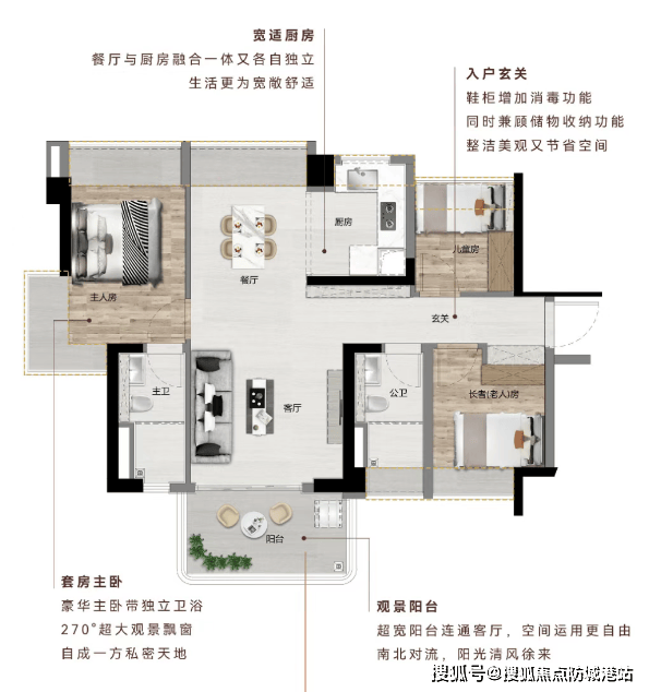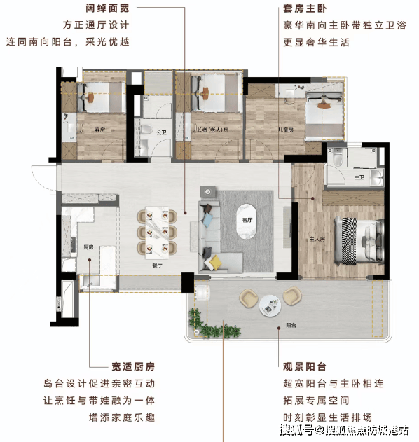 129平方米四房两厅两卫:6.8米宽阔阳台,南向珠江景观,LDK一体化设计。