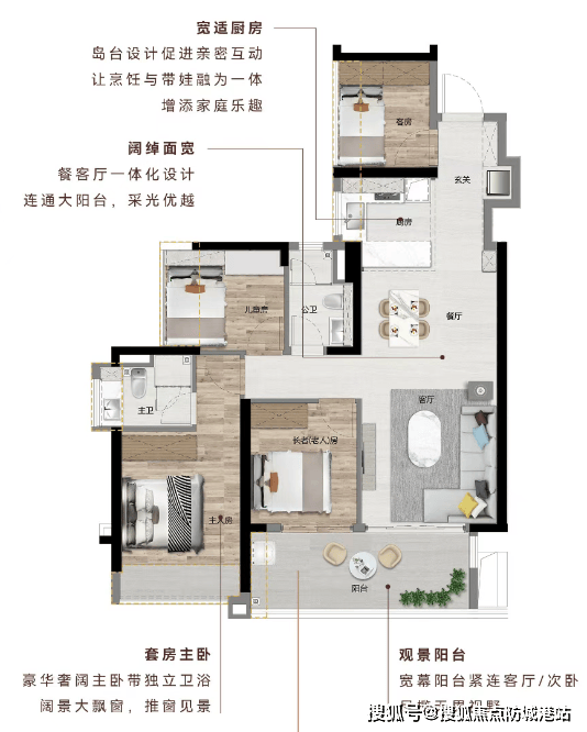 108平方米四房两厅两卫:南向无遮挡,拥有U型厨房和IMAX版厅。