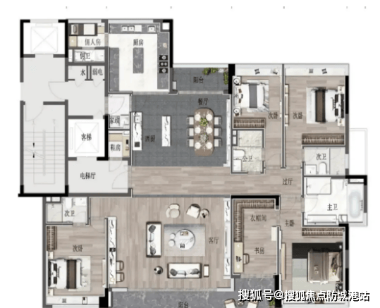 1. 户型布局:该户型为高端改善五室设计,布局方正,南北通透,采用“四叶草”布局,四个卧室分布在四个角落,互不干扰,私密性极强;客厅、餐厅、阳台形成一体化开阔空间,同时配备独立书房、茶室,满足高端家庭的社交、办公、休闲需求。