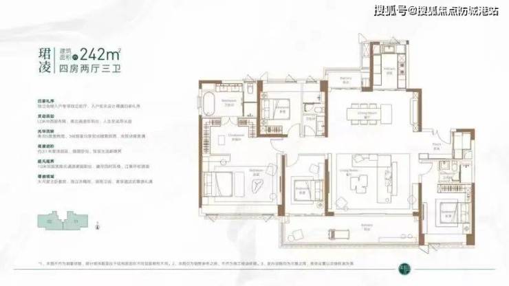 242㎡为4房2厅3卫设计,专梯专户,带南北双阳台,景观阳台开间约10米宽,可望江景。