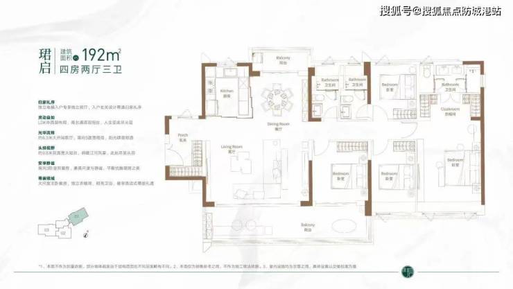 从目前曝光的户型图来看,192㎡为4房2厅4卫,五开间朝南,客厅开间约6.3米,阳台约9.8米,带独立电梯入户设计。