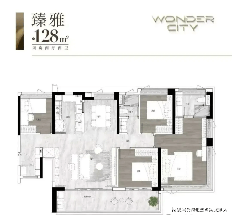 128㎡ 四房两卫:独立入户花园+横厅布局,7.2米超宽阳台,三间卧室朝南,长辈房与儿童房尺度均衡,兼顾私密与互动。