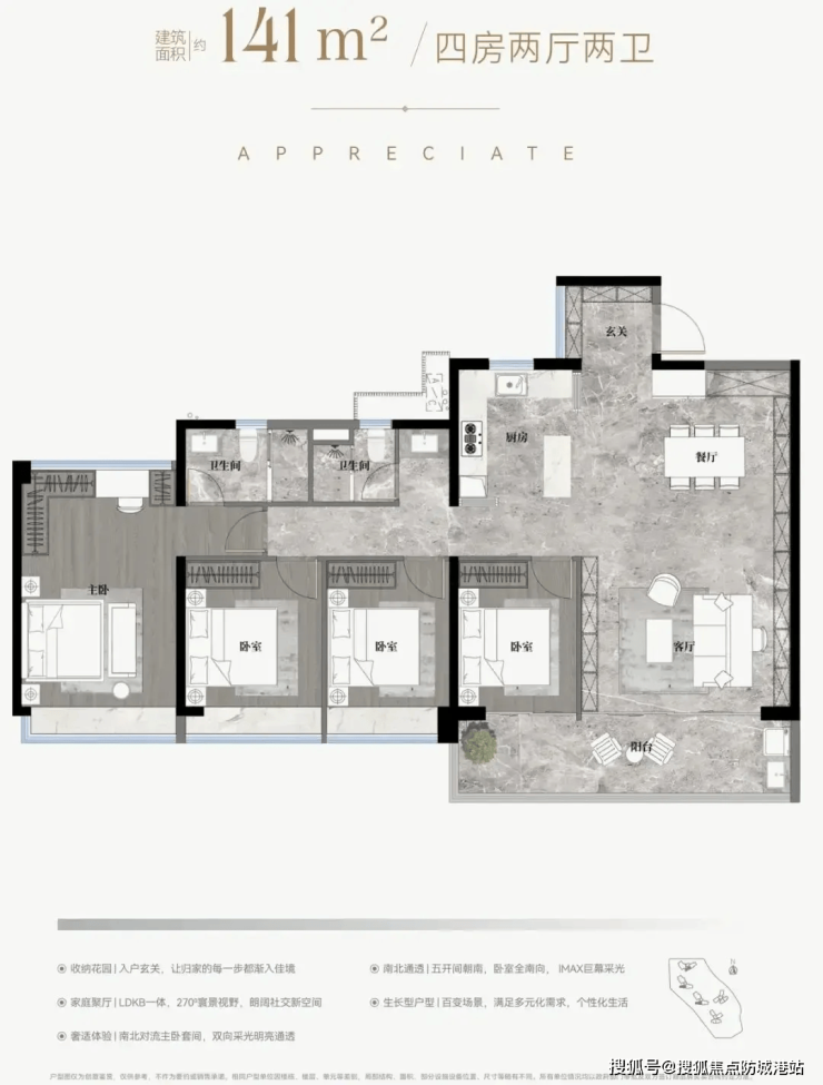 141㎡ 四房三卫:双套房设计,主卧配独立衣帽间+卫浴,5.8米客厅开间,U型厨房预留双开门冰箱位,满足多代同堂高品质生活。