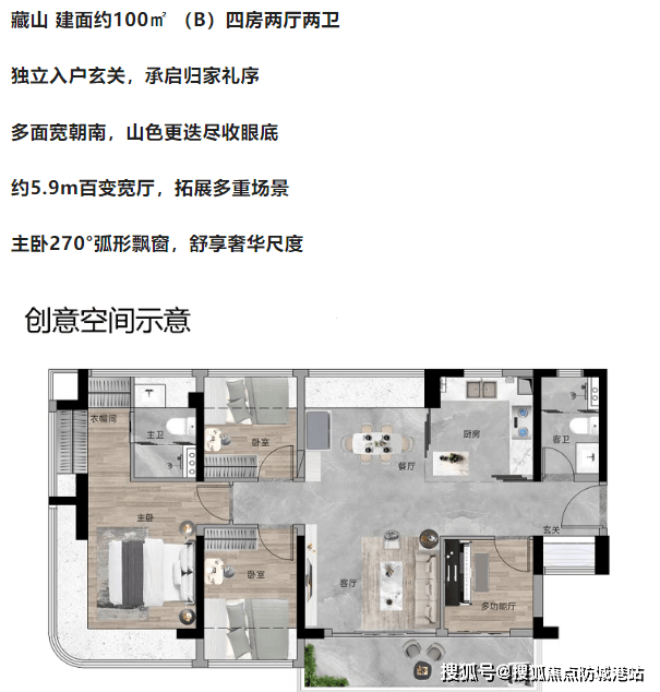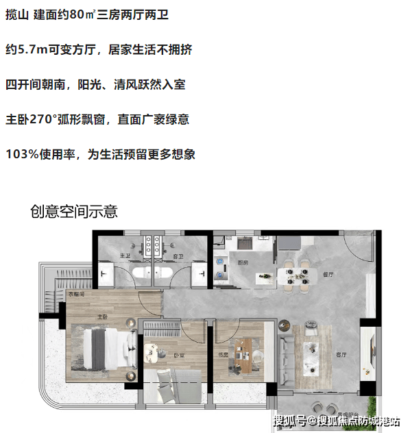 我去研究了一下它的户型图,发现秘密在于“可变空间”和“飘窗设计”。比如那个80平的“揽山”户型,四开间朝南,主卧居然搞了个270度的弧形飘窗。这飘窗面积是不计入产权面积的,但实实在在增加了使用空间。还有那个5.7米的可变方厅,通过灵活隔断,可以让空间利用率最大化。96平的户型更是做了LDK一体化(客餐厨一体),加上5.7米的双面宽阳台,视觉空间感极强。