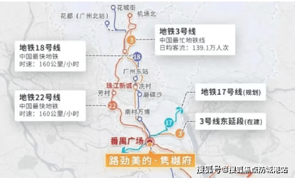 更为难得的是,项目坐拥四地铁交汇的黄金交通网络:3号线、18号线、22号线在此交汇,规划中的17号线也将进一步强化区域通达性。从隽樾府出发,步行约800-900米即可抵达番禺广场地铁站,无需换乘,即可快速直达珠江新城、琶洲等核心商务区,高效通勤为都市精英节省宝贵时间。自驾出行亦十分便捷,番禺大道、南沙港快速等主干道环绕四周,畅达全城。