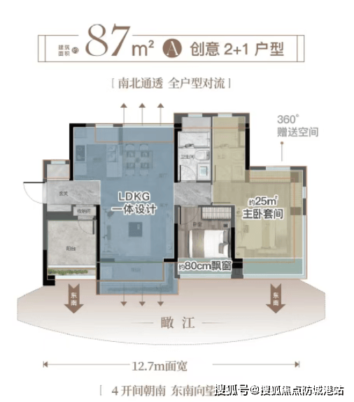 87㎡A户型:全小区最后一梯腿珍藏房源,四开间朝南,南北通透;约3.8米奢阔横厅搭配LDK一体化设计,空间感十足;主卧L型飘窗实现270°观景,揽园望江,静谧怡然。