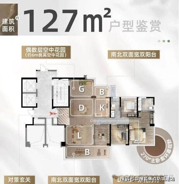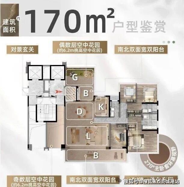 约6米挑高的空中院,圆满都市人的云端田园梦:一梯一户纯(部分户型)粹格局,立序归家礼序:行政主卧套房设计,转角270°环幕全景窗尽享江山湖美景:LDKG一体化巨厅搭配双阳台,从容承载家庭成员的欢聚与成长