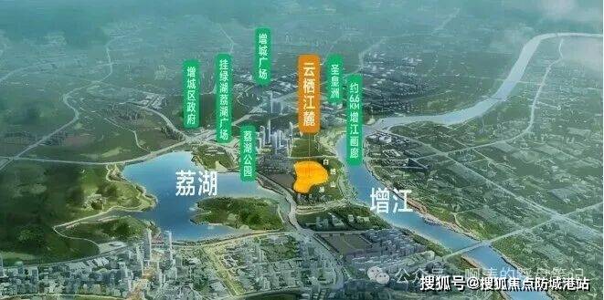 1.位于荔湖新城核心地段,与增城区府仅一路之隔,坐拥“江+湖+园”三重生态资源,西临增江,东接荔湖,内部还规划了2.6万㎡内湖,形成“一江双湖”景观,且周边无高层遮挡,自然景观资源稀缺。