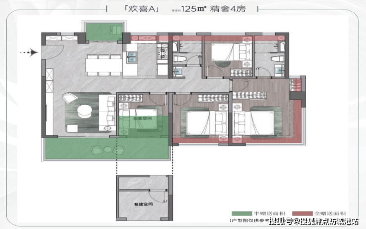 保利灯湖天珺二期主推的125㎡新规四房,堪称“空间魔术师”。得益于佛山2024年实施的新规政策(取消部分公摊限制),该户型实现约106%的超高使用率,实际得房面积远超传统125㎡产品。核心亮点在于约65㎡的社交巨厅——6.6米大开间客厅打破墙体束缚,可灵活划分为亲子互动区、家庭影院或会客空间。四间卧室均实用:主卧带飘窗,次卧可轻松放下1.5米床,彻底告别“书房式小房”尴尬。南北双阳台设计,南向生活阳台连接客厅,北向服务阳台兼顾家政与通风。据2026年1月最新销控,该户型总价290万起,折合单价约2.32万/㎡,在同区位双地铁+双名校盘中极具性价比。更值得期待的是,即将加推的139㎡四房将进一步放大空间尺度,满足多代同堂或改善型需求。
