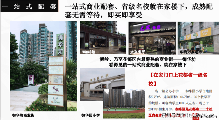 项目自身配套7000㎡风情商业街,狮岭最醇熟的商业街——御华坊,华润万家、咖啡店、药店等生活配套应有尽有。5分钟车程可达雅乐城、7分钟车程可达融创文旅城、15分钟车程可达骏壹万邦。
