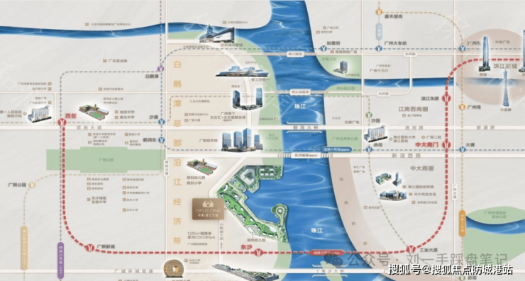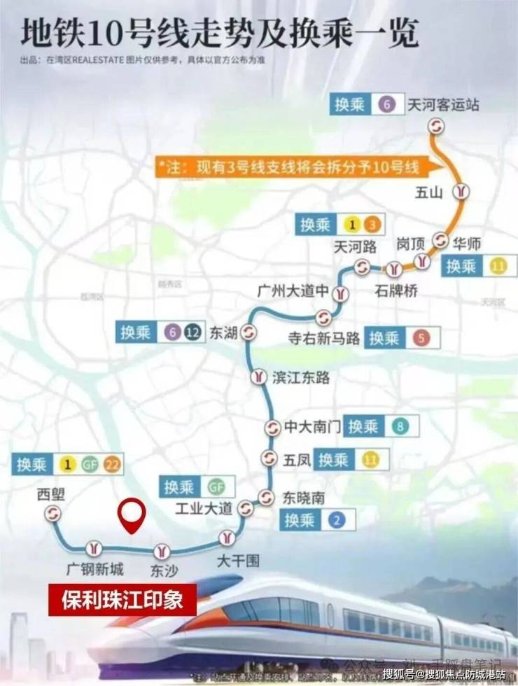 地铁10号线(在建,2027年底通车): 项目距离东沙站约700米(实测步行约10分钟)。10号线为广州东西向大动脉,4站直达中大(换乘8号线),6站直抵滨江东,无需换乘即可畅达珠江新城(约30分钟)。根据广州地铁集团最新工程简报,10号线土建工程已完成85%,通车在即。