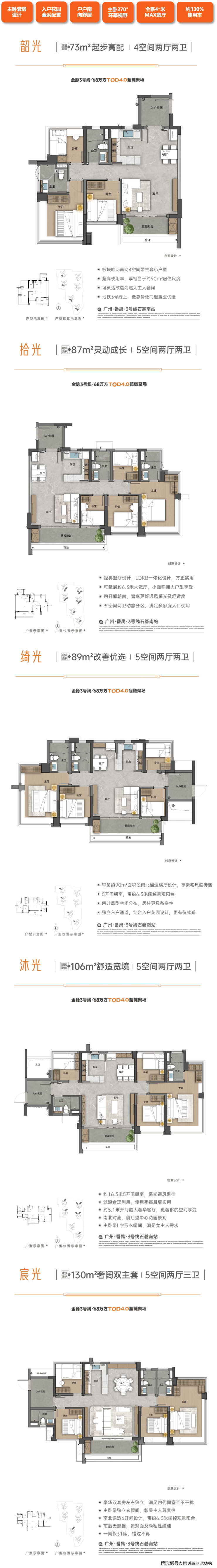 在售户型:73㎡三房两卫、89㎡四房两卫、130㎡五房双主套;