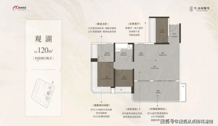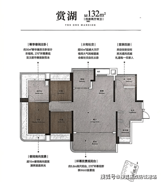 131/132㎡ 横厅四房:打造超50㎡大方厅,5.8米景观阳台,主卧面积约30㎡并配独立衣帽间,私密性与尊崇感兼具。