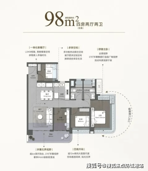 98㎡ 3+1房两卫:LDKB一体化设计,四开间朝南,6米景观阳台引入充足阳光;主卧配备270°环幕飘窗,灵活改造为第四房,适合三口之家或计划二胎的家庭。
