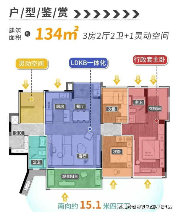 134㎡三房两卫:LDK一体化布局,四开间朝南,南向采光面宽达14米,观景面约15.6米,实现家庭互动与景观享受的完美融合;