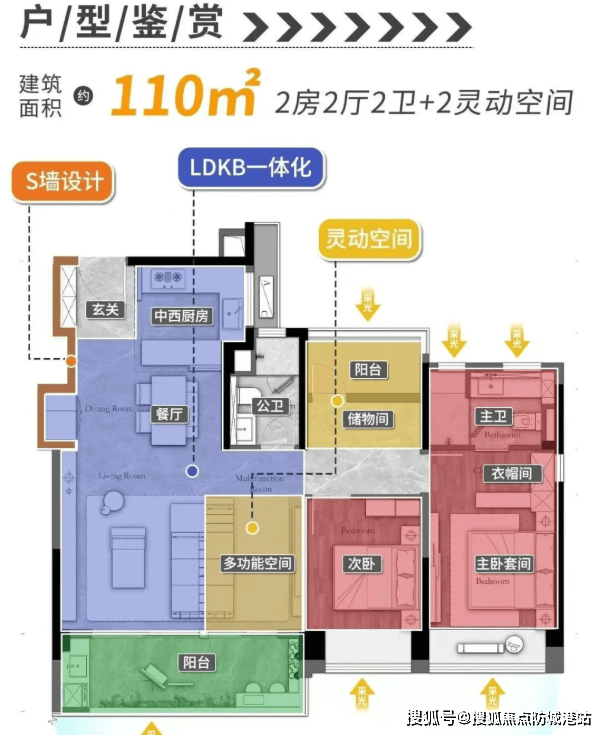 110㎡三房一卫:超高实用率,三开间朝南,观景面达约11.6米,5.7米大开间客厅,空间通透敞亮;