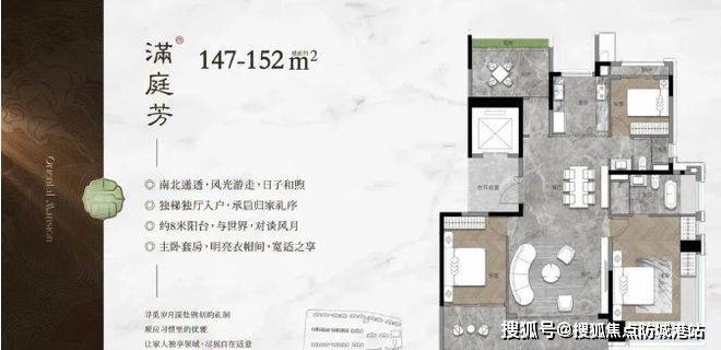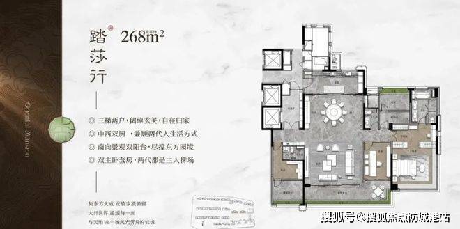 户型设计独具匠心。板式楼栋采用一字板式布局,户户朝南,不仅保证了良好的采光通风,还尽显东方美学。楼间距宽,均好性强,每一户都能享受充足阳光和园林视野。梯户比低,143 平户型也能专梯专户,舒适度高。268 平大户型更是亮点满满,3T2 户设计,有保姆电梯和保姆房,保证私密性。双主套互不干扰,LDKG 近 120 平大方厅,空间利用率高。主卧步入式衣帽间、双台盆配置,还有超 9 米的 270° 全景飘窗,设计精巧,满足高端居住需求。
