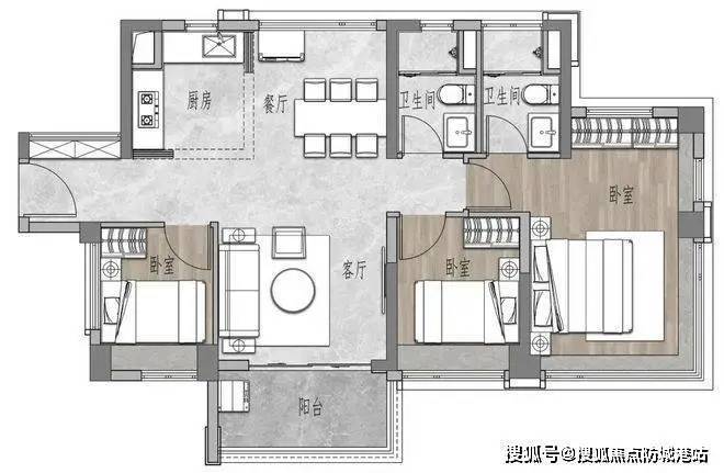 建面约85㎡三房两卫:西部少有的非超高层南向三房,分传统竖厅和南北对流两种户型,所有卧室朝南,6米大开间搭配双卫设计,满足家庭成长需求。