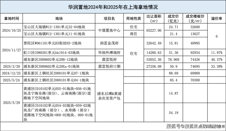 再看华润置地在上海的布局,2023年在上海拿地投资位居首位,去年在上海拿地5宗,总成交价192.3亿元。到了今年,华润置地报名参拍了六个批次土拍中的多个批次多幅地块,仅成功补仓新杨思地块(翡雲悦府Ⅱ期),其他参拍均无所获。
