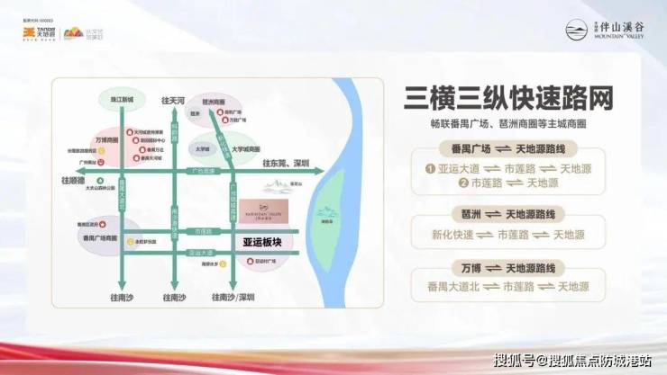 天地源·伴山溪谷拥有极佳的交通优势,项目距4号线石碁地铁站仅600米,步行即可轻松抵达,实现便捷地铁出行。4号线直通大学城和琶洲商圈,方便居民上下班及休闲购物。未来3号线东延段海傍站开通后,项目将享受双线地铁交汇带来的通勤便利,多条地铁线路汇聚极大提升出行选择。此外,项目周边规划有三纵三横的主干道路网,包括番禺大道、华南快速、广州绕城高速及亚运大道等,驾车出行同样便捷。15至25分钟内可到达番禺广场、大学城、琶洲CBD等核心商圈,通勤效率高,适合上班族及多样生活需求。