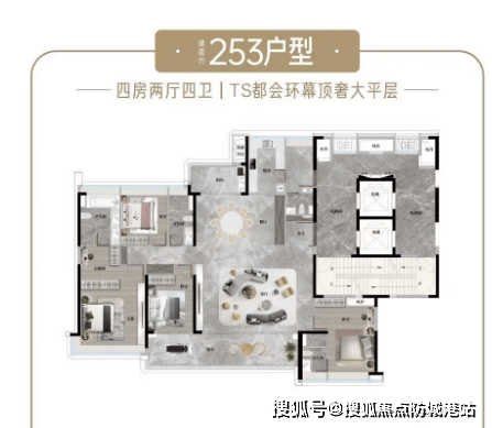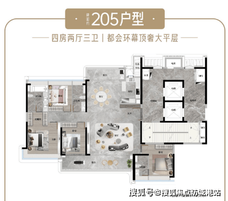 205㎡楼王四房:实测套内面积约 188㎡,使用率 91.7%,近 9 米巨幕阳台(半赠送面积约 10.5㎡),双主卧套房设计,总统级主卧配备双洗手台与浴缸,中轴园林景观一览无余,高端改善属性突出。