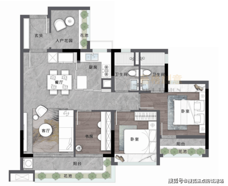 约89㎡ 3+1房2厅2卫:四开间九面采光,全明通透户型,配备5.6米双面宽阳台,独立主套。