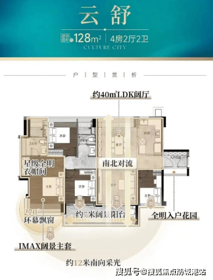 建面约128㎡:四房设计,约16米南向采光,南北对流,约40㎡LDK阔厅。