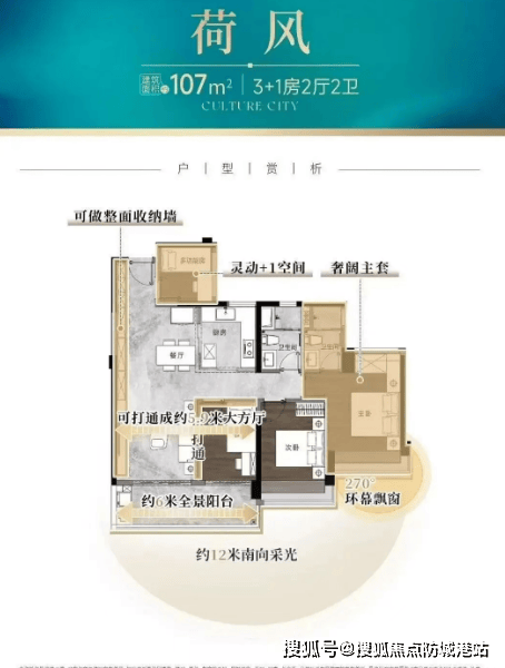 建面约107㎡:四房设计,拥有12米南向采光面,LDK一体化设计,约6米奢阔阳台,带有独立入户花园。