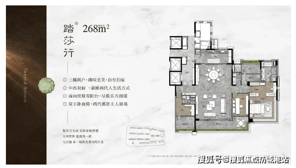 保利天瑞的产品力,堪称近年广州改善市场的教科书。全盘以8-20层小高层板楼为主,采用2T2、3T2等低梯户比设计,即便是143㎡户型也能实现专梯入户,268㎡旗舰更是配备保姆电梯+双主套,私密性与尊崇感拉满。所有楼栋一字排布、户户朝南,楼间距达40-50米,远超市中心普遍35米的局促标准,确保后排低楼层也能享受充足采光。其中,268㎡户型堪称“空间魔术师”:LDKG一体化大方厅近120㎡,南北对流;主卧配备双衣帽间、双台盆、270°全景飘窗(面宽超9米);另一主套可灵活改造为书房或影音室。而125㎡户型更暗藏“惊喜”——右上角交付即为完整房间,实现四房实用格局。每一寸空间,都经得起严苛审视。