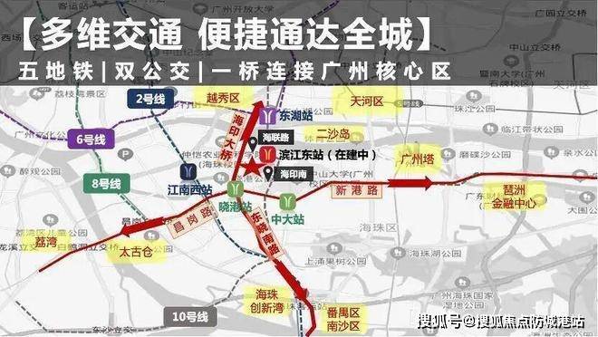 交通:交通网络极为发达,堪称出行便捷的典范。一公里内享双地铁,8 号线晓港站近在咫尺,10 号线滨江东路站(在建中,预计 2023 年开通)与项目距离不足 800m。家楼下就是海印桥南公交站,多达 24 条公交线路穿梭广州主城各区,方便快捷。此外,多维路网交织,向北接海印大桥可通达越秀天河,向东接新港西路能直达琶洲金融中心,向南快速接驳南洲、番禺、南沙,无论是日常通勤还是出行游玩,都能轻松实现。
