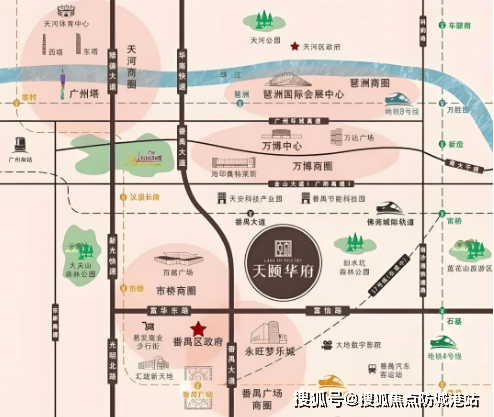 天颐华府地处番禺广场板块,这里是四条地铁线交汇的核心区域(3号线、18号线、22号线、17号线),构建了一个枢纽级的交通中心。通过“五纵三横”的立体路网,居民仅需25分钟即可抵达珠江新城CBD国际生活圈。周边商业配套齐全,五分钟车程内可达永旺梦乐城、基盛万科中央公园等大型购物广场;十分钟内可至市桥的易发商业街和钻汇广场。医疗资源同样丰富,附近有多家知名医院,如何贤纨念医院、番禺中医院等。