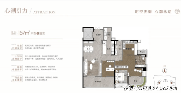 项目主打大平层户型,包括157平米、196平米、203平米、253平米和257平米等多种选择。所有户型均为双阳台配置,设计注重采光最大化,并采用全球顶尖团队进行建筑设计、园林规划以及室内装修。特别值得一提的是,部分户型拥有270°弧形飘窗,提供了全面屏的景观视野,提升了居住舒适度和尊贵感。