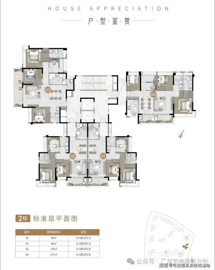 4、户型设计合理:提供98-143㎡的多种户型,以南向为主,采光通风良好,部分户型带有270°转角飘窗,赠送面积较多,得房率较高。