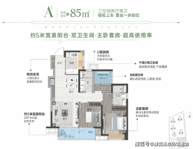 在售户型包括85㎡三房两厅两卫、98㎡四房两厅两卫以及103㎡四房两厅两卫(横厅)。这些户型均采用了全南向设计,保证了充足的采光和通风效果。特别是,98㎡户型为区域内唯一的97㎡四房户型,非常适合精英阶层的家庭居住需求。此外,户型使用率高达94%,大大提高了居住舒适度。