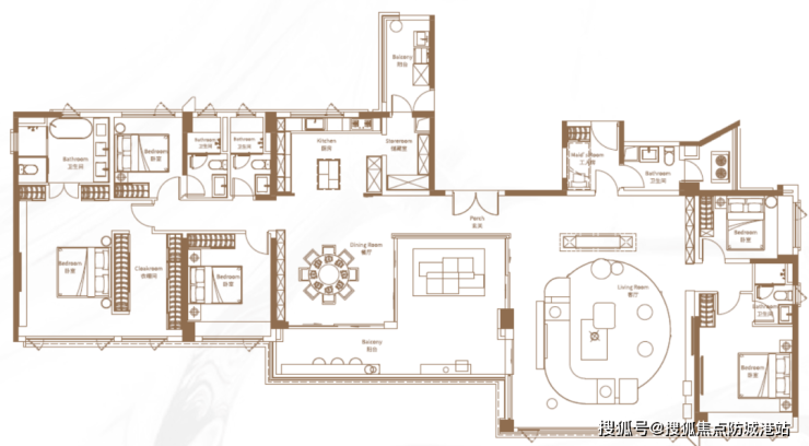 354㎡六房五卫:双开大门设计,行政客厅面积达70㎡,餐厨一体化的设计,满足高端家庭需求。