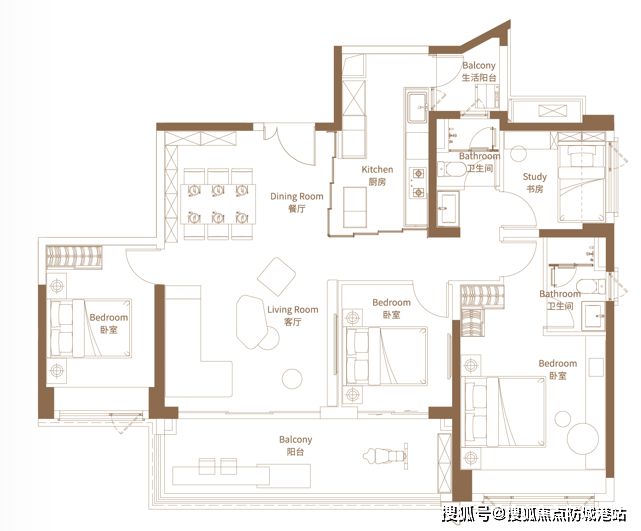 193㎡四房三卫:南北对流双阳台,主卧配备独立衣帽间及卫浴,空间布局合理;