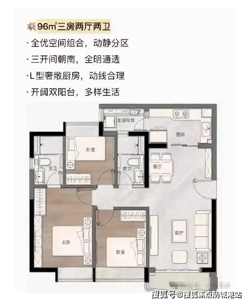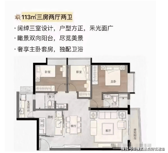 户型设计:主推69-144平方米的二至四房,户户双阳台,LDK一体设计,东南向望江赏景。
