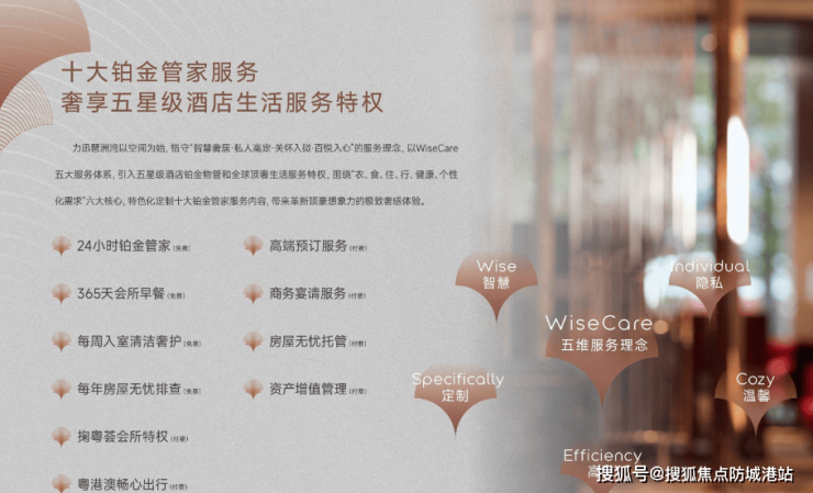 力迅·琶洲湾为业主提供顶级的物业服务,基于WiseCare服务体系,涵盖“十大铂金管家服务”、“掬粤会艺术会所服务”及“高奢定制服务”。会所功能面积约1800平方米,设有行政酒廊、江幕泳池、天际健身房等多种高端休闲设施,为会员提供尊贵的生活体验。