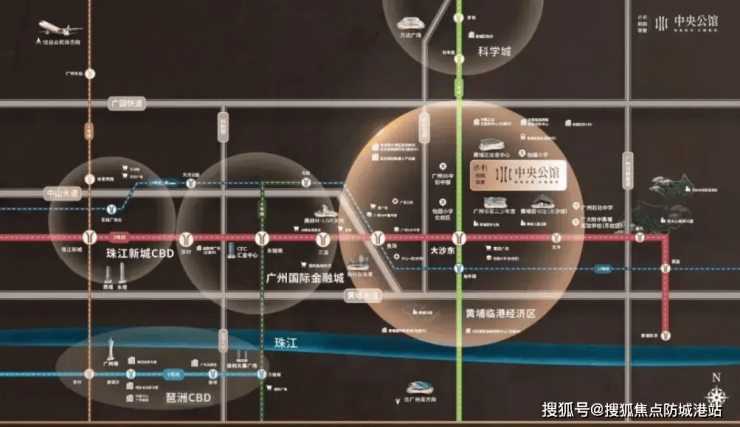 中央公馆占据黄埔区核心腹地,地理位置堪称“黄金三角”——北接科学城,南连金融城,东望黄埔港,是广州“东进”战略的关键节点。项目步行约550米即达地铁5号线与7号线二期(在建)交汇站大沙东站,实现真正的双轨交汇。