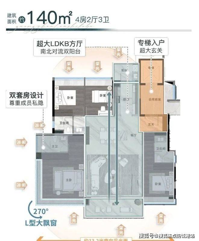 户型设计亮点满满。项目分南北地块,共 25 栋 45 - 52 米低密度小高层,“前低后高” 梯级跌落设计,尽享湖景。户型为建筑新规后产品,使用率超高。板楼设计,2 梯 2 户,近似 1 梯 1 户,私密性好。采用 LDKG 一体化设计,空间宽敞通透,减少承重墙,布局灵动。窗地比高达 38%,主卧 270° 大飘窗,采光观景极佳。如建面约 140㎡户型双主套、南北双阳台;建面约 190㎡户型南向面宽约 17 米;建面约 250㎡户型奢阔层高,一线观湖,满足不同改善需求。