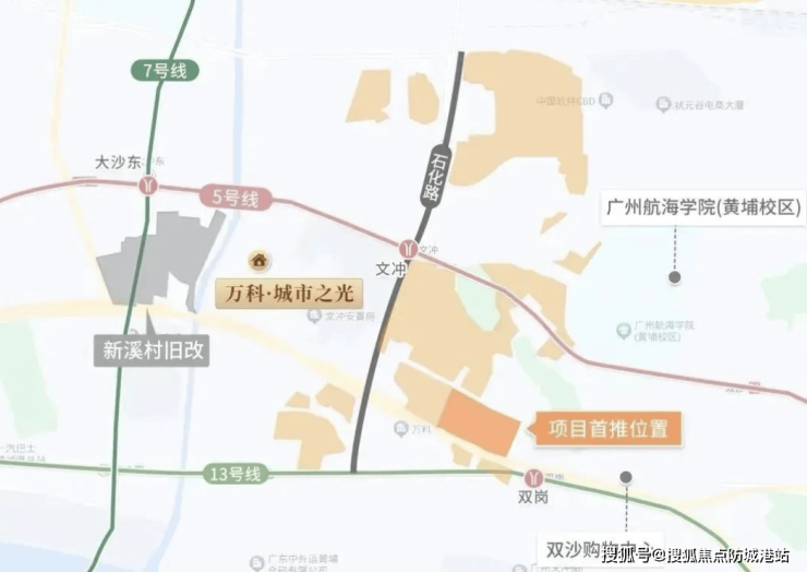 项目交通优势十分明显,地处黄埔东路与石化路交汇处,紧邻地铁13号线双岗站和5号线文冲站。其中双岗站步行约7分钟即可抵达,文冲站则通过广新路转石化路步行约14分钟。13号线将继续向珠江新城、天河北、越秀等中心区延伸,开通后可实现快速通勤覆盖广州市主城区。乘坐5号线则可直达金融城、珠江新城,轨道交通网络极具前景。自驾方面,项目旁即为黄埔东路主干道,连接中山大道、广深沿江高速等通勤大动脉,无论是市区通勤还是跨城出行均十分便利。对于科技园区及CBD从业者而言,未来方洲无疑是距离与效率兼顾的理想选择。